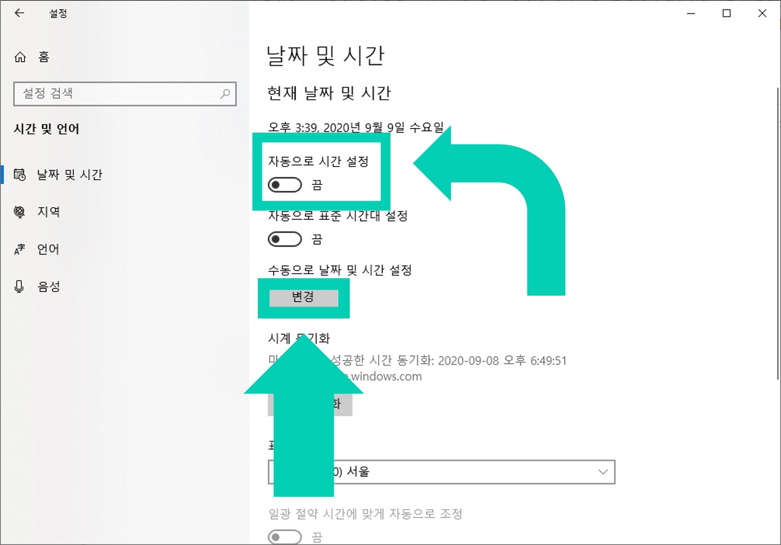 3) 날짜 및 시간 탭에서 자동으로 시간 설정을 off 수동으로 날짜 및 시간 설정 아래에 변경을 클릭