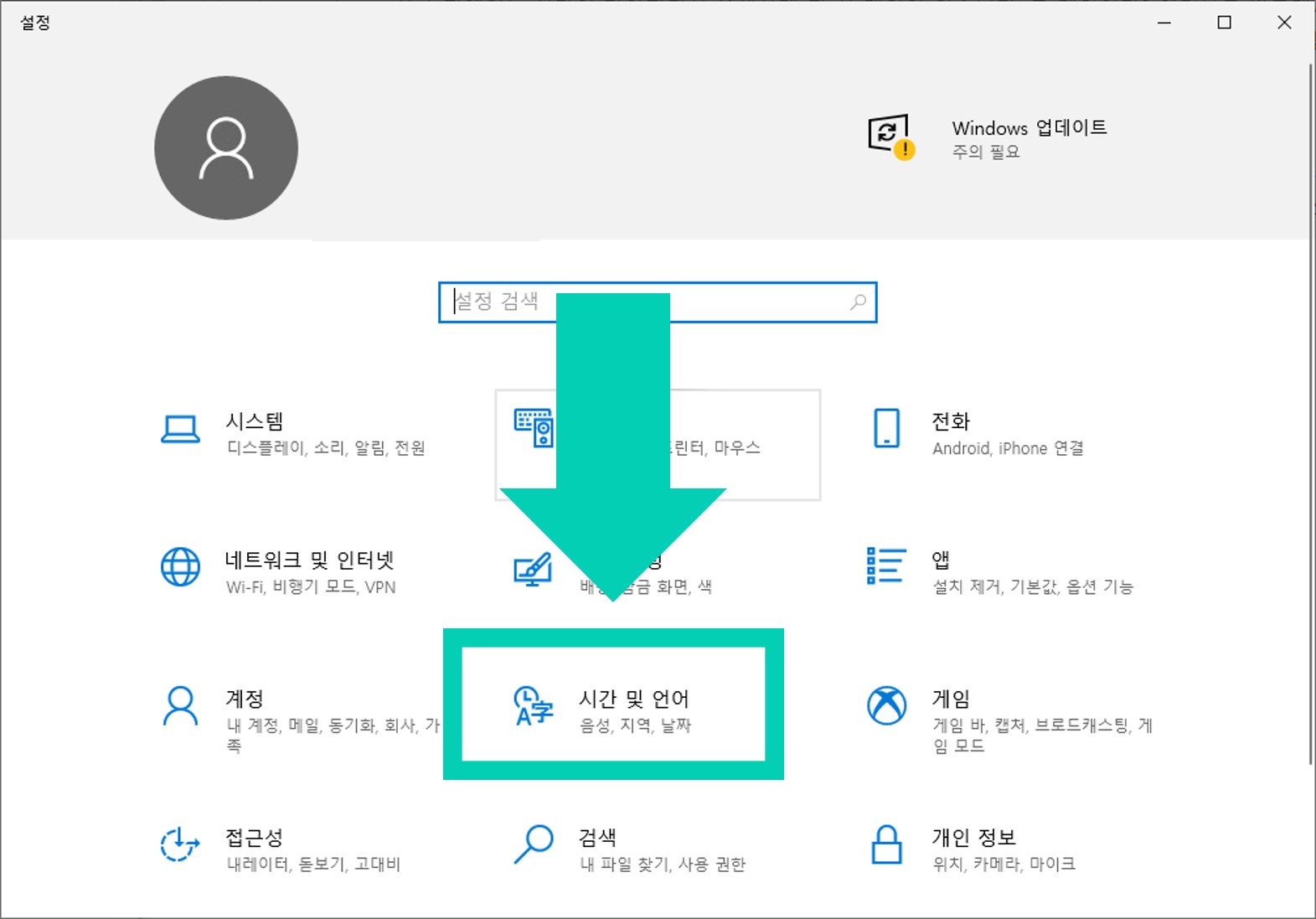 2) 여러가지 설정 중에서 시간 및 언어를 클릭