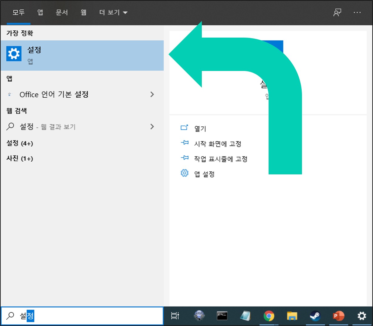 1) 하단 윈도우 검색기를 이용하여 설정을 검색 후 클릭