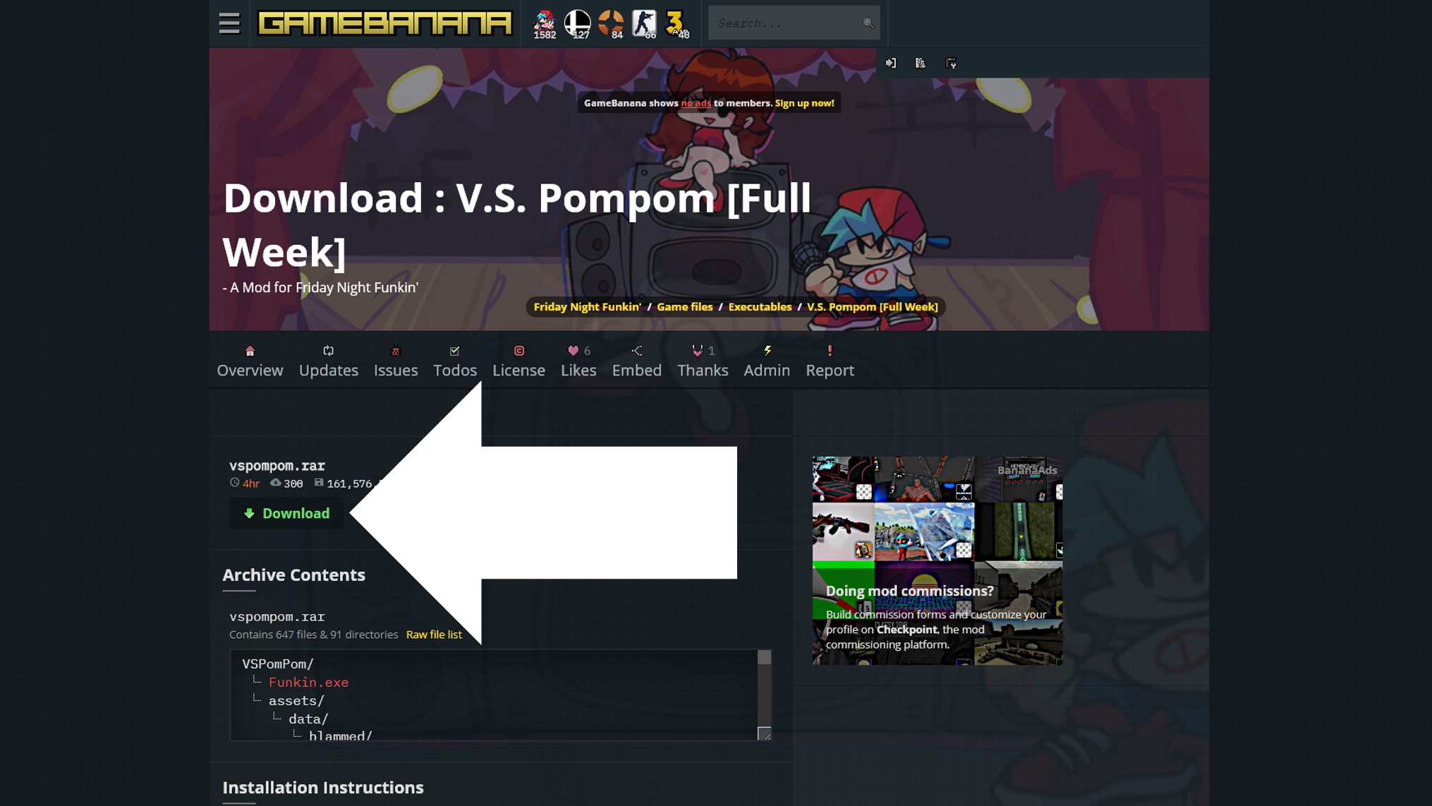 폼폼 모드를 다운로드는 게임 바나나 폼폼 모드 페이지로 이동한 후 페이지 상단에 있는 vapompom.rar 파일 아래에 있는 다운로드(Download) 버튼을 클릭해 파일을 설치해주세요.
