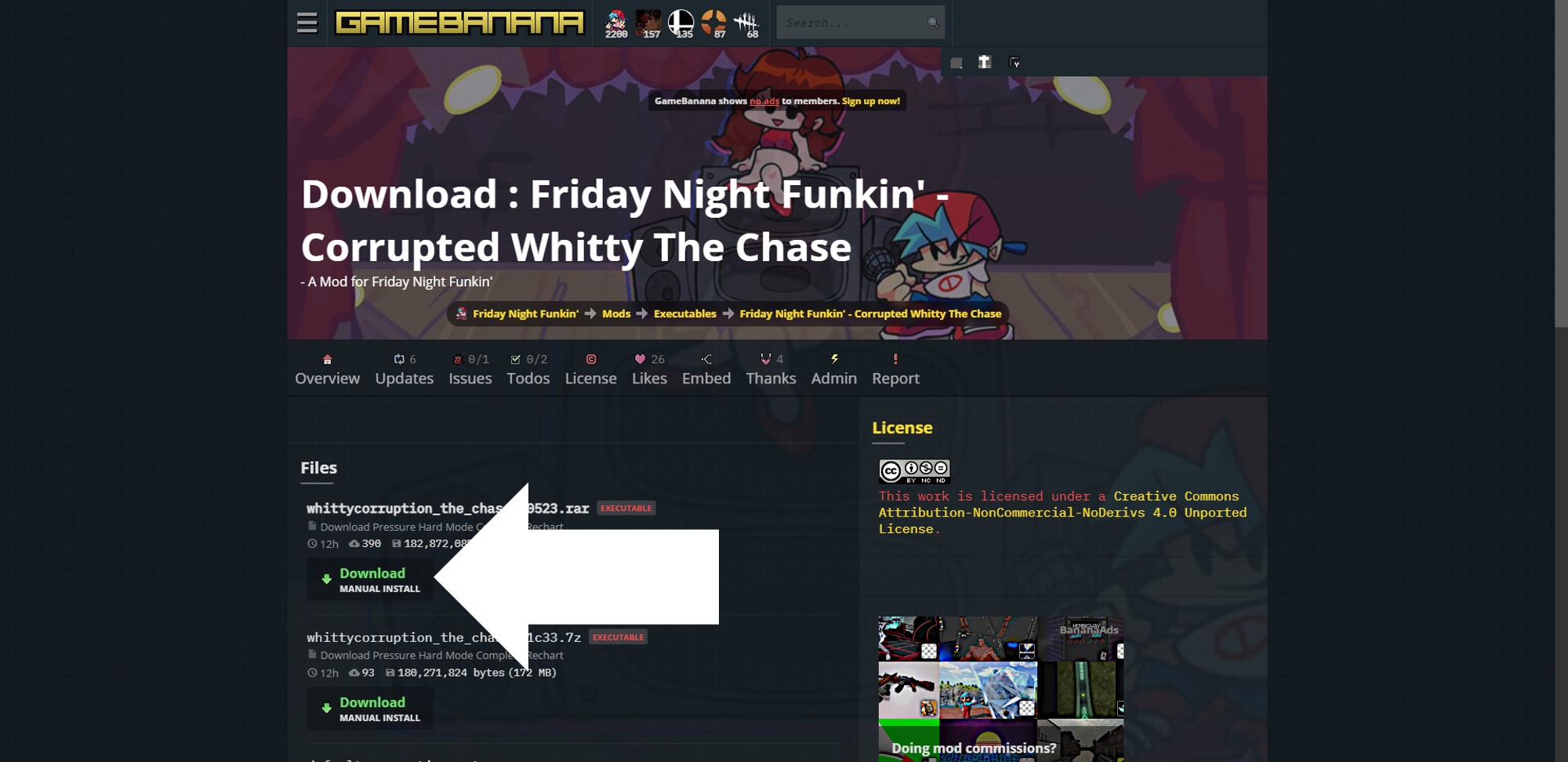 다운로드는 게임 바나나 위티 이블모드 모드 페이지로 이동한 후 페이지 좌측 상단에 있는 whittycorruption_the_chase.rar 파일 아래에 있는 다운로드(Download) 버튼을 클릭해 파일을 설치해주세요.