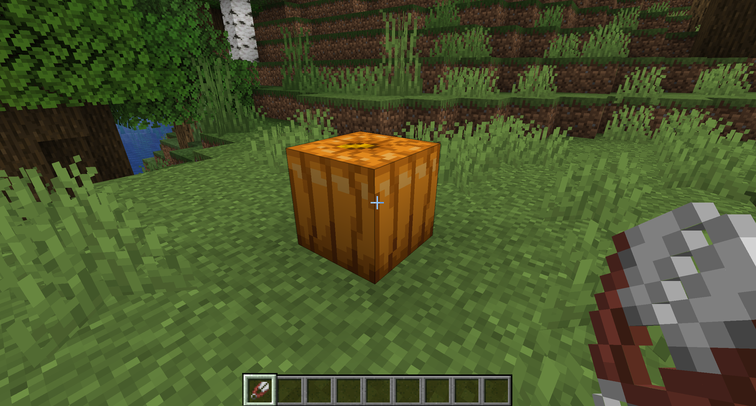 먼저 서바이벌 모드에서 철골렘을 만드는 방법에 대해 알아보도록 합시다. 우선 철골렘을 만들기 위해서는 조각된 호박과 철블럭 4개가 필요한데요. 철블럭은 철 9개로 만들 수 있는 것을 다들 아시겠지만 조각된 호박은 따로 조합 레시피에 나오는 것이 아니기 때문에 모르시는 분들도 많을 것 같습니다. 조각된 호박을 얻는 방법은 일반 호박을 설치한 후 가위로 우클릭을 해주시면 됩니다. 아주 간단하죠?