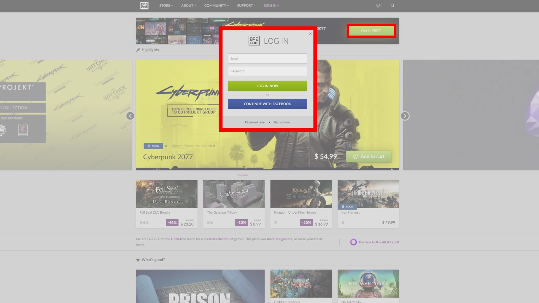 그 후 Get it FREE를 클릭해주세요. 만약 GOG 로그인이 되어있다면 바로 받아질 것이지만 로그인을 하지 않았거나 회원가입을 한 적이 없다면 로그인 창이 뜨게됩니다. 여기서 페이스북 계정이 있다면 파란색 버튼을 클릭해주신 후 페이스북으로 로그인해주시면 되겠습니다. 없다면 아래에 있는 SIGN UP NOW를 눌러 회원가입을 진행해주세요.