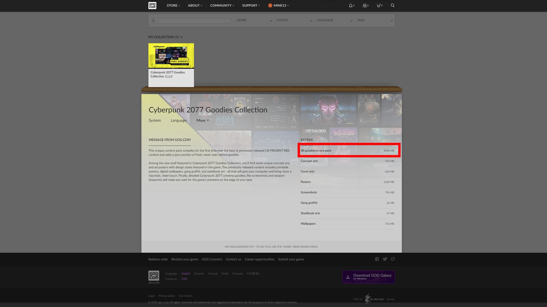 로그인을 마쳤다면 다시 한번 Get it Free를 클릭해주시면 사이버펑크 2077 굿즈 컬렉션을 무료로 받게됩니다. 그 후 MY COLLECTION(www.gog.com/account)에 들어오신 후 사이버펑크 2077 굿즈 컬렉션을 클릭해주세요. 마지막으로 All goodies in one pack을 클릭해주시면 굿즈가 다운로드 됩니다.